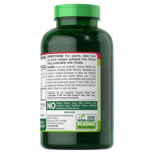 بهترین مواد در هر ویتامین و مکمل Nature's Truth® وجود دارد. این ژل های نرم 2400 میلی گرمی روغن ماهی غیر GMO هستند و فاقد گلوتن، گندم، مخمر، شیر، لاکتوز، رنگ های مصنوعی، طعم دهنده ها، شیرین کننده ها و مواد نگهدارنده هستند.