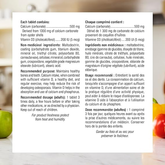 هر قرص حاوی: مواد دارویی: کلسیم (کربنات) 500 میلی گرم، ویتامین D3 200iu (5 میکروگرم)، مواد غیر دارویی: سلولز، سدیم کراسکارملوز، صمغ اقاقیا، استئارات منیزیم درجه گیاهی (روان کننده) و پوشش. فاقد هرگونه رنگ مصنوعی، نگهدارنده یا شیرین کننده، ذرت، لبنیات، سویا، نشاسته، گندم یا مخمر است.