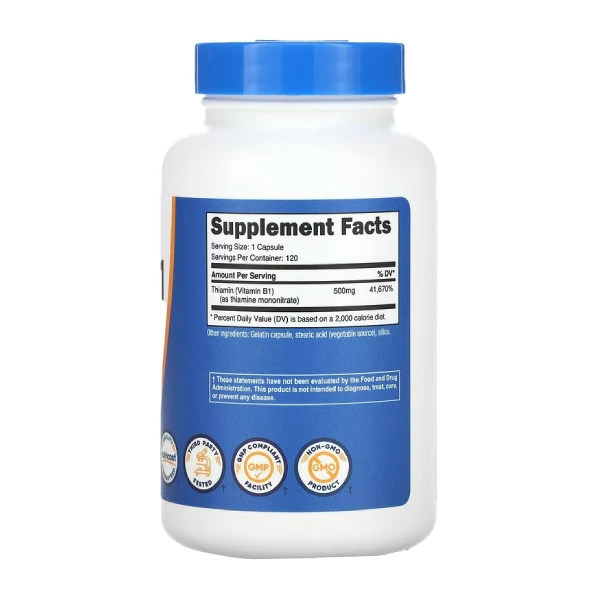 مشخصات: نوتریکاست (NutriCost) کشور سازنده: آمریکا دسته بندی محصول: مکمل غذایی ویتامینها نوع محتویات محصول: قرص ویتامین ب1 (تیامین) تعداد و وزن محتویات: هر بطری شامل ۱۲۰ قرص دوز محتویات محصول: 500 میلیگرم تیامین (ویتامین ب1) در هر قرص