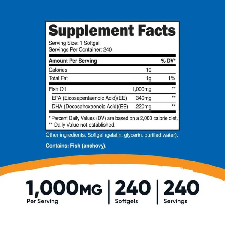 1000 میلی گرم روغن ماهی 560 میلی گرم EPA و DHA فاقد GMO و فاقد گلوتن هر سروینگ برابر است با 1 سافت ژل 240 سروینگ 240 عدد سافت ژل کشور سازنده: آمریکا
