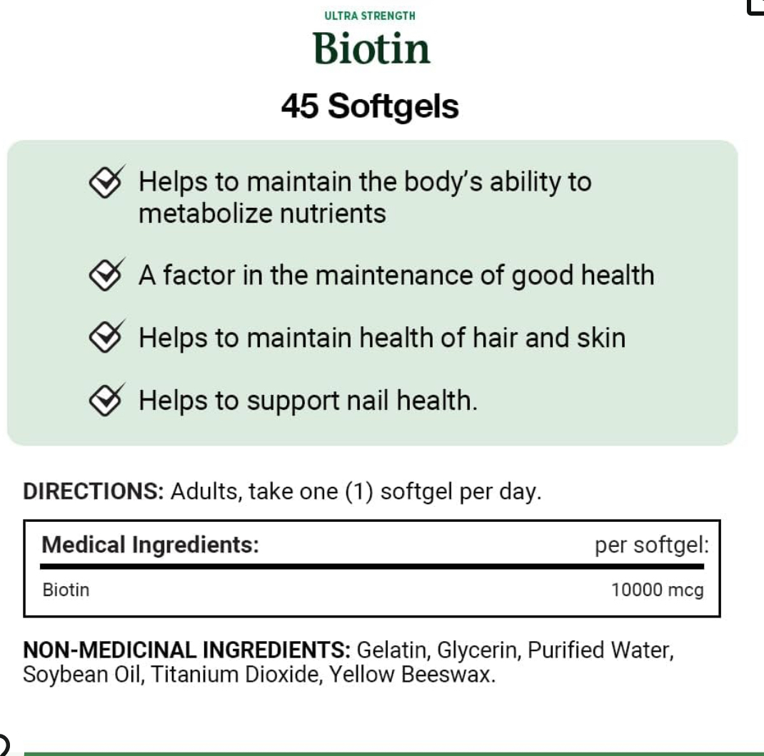 Nature's Bounty Biotin Supplement, Promotes Hair Growth and Strong Hair, 10000mcg, 45 Softgels