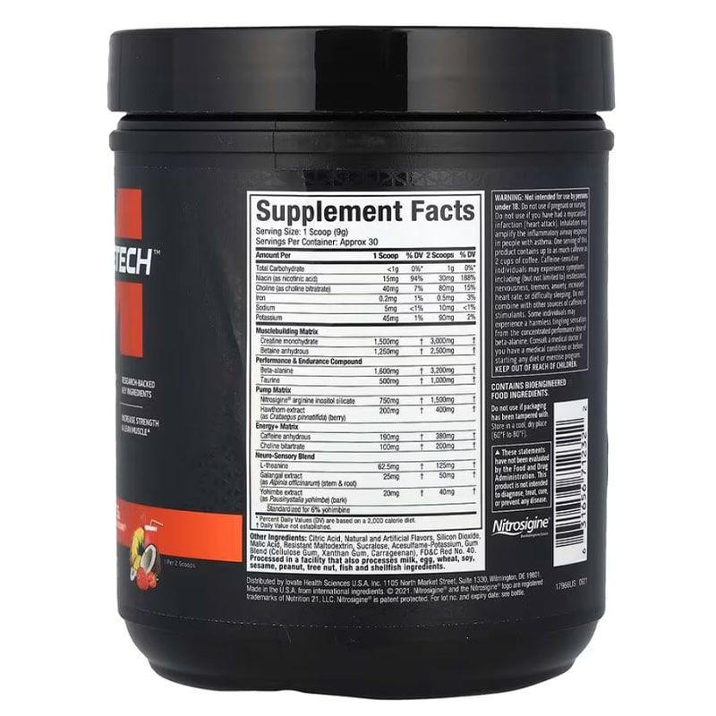 هر پیمانه ( 8 گرم ) حاوی کمتر از 1 گرم کربوهیدرات ، 30 میلی گرم ویتامین C و 0.5 میلی گرم ویتامین B6 و 6 میکرو گرم ویتامین B12 و ماتریس عملکردی و استقامتی ( 1.6 گرم بتا آلانین و 500 میلی گرم تائورین ) ، ماتریس پمپ ( 1.5 گرم ال سیترولین ) ، ترکیب عضله سازی ( 1.5 گرم کراتین منوهیدرات ) ، ماتریس انرژی انفجاری ( 190 میلی گرم کافئین بی آب و 50 میلی گرم عصاره ی کاکائو ) و ترکیب حسی عصبی ( 100 میلی گرم کولین ، 50 میلی گرم ال تیانین و 50 میلی گرم عصاره ی گالنگال )