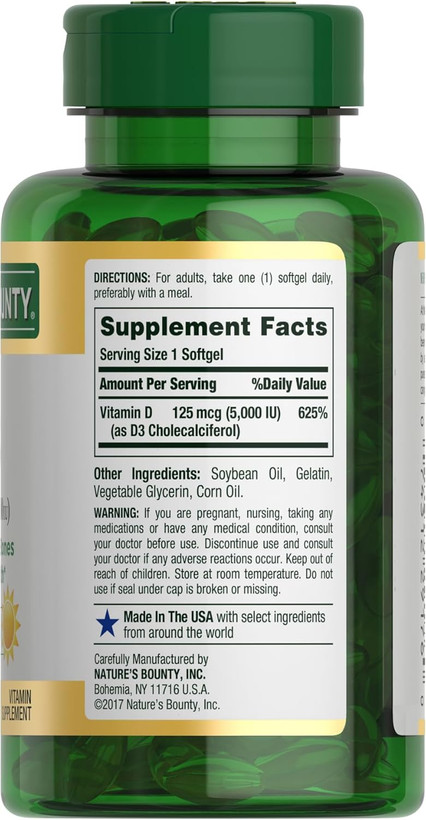 Nature’s Bounty Vitamin D3 5000 IU یک مکمل قدرتمند برای تقویت سیستم ایمنی، سلامت استخوانها و عملکرد عضلات است. ویتامین D3 (کولهکلسیفرول) به افزایش جذب کلسیم و فسفر کمک کرده و در بهبود سلامت مفاصل، استخوانها، و عملکرد سیستم ایمنی نقش مهمی دارد.