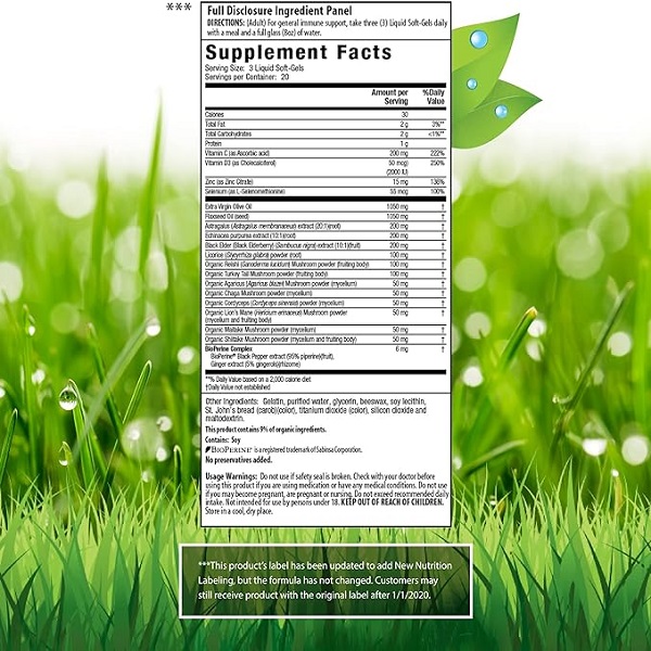 علاوه بر ترکیب 8 قارچ بالا این محصول با ویتامین C، زینک و ویتامین D3 غنی سازی شده است. این فرمول همچنین شامل گیاهان تقویت کننده سیستم ایمنی از جمله اکیناسه، سنجد سیاه، شیرین بیان و گون می باشد.