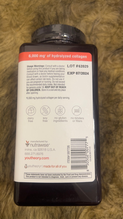 مکمل کلاژن برند Youtheory در هر وعده غذایی مقدار6000 میلی گرم کلاژن هیدرولیز شده و 90 میلی گرم ویتامین Cرا وارد بدن می کند. فرمولاسیون پیشرفته و هیدرولیز شده ی کلاژن که حاوی 18 اسید آمینه است، به راحتی هضم شده و به سرعت در بدن جذب می شود و کلاژن بدن را مجددا بازسازی می کند. پپتید های کلاژن به همراه ویتامین Cبه احیا و تقویت پوست، مو، ناخن، تاندون ها و رباط ها و ... کمک کرده و با اثرات پیری مبارزه می کند. قرص کلاژن یوتئوری فاقد لبنیات، سویا و گلوتن می باشد.
