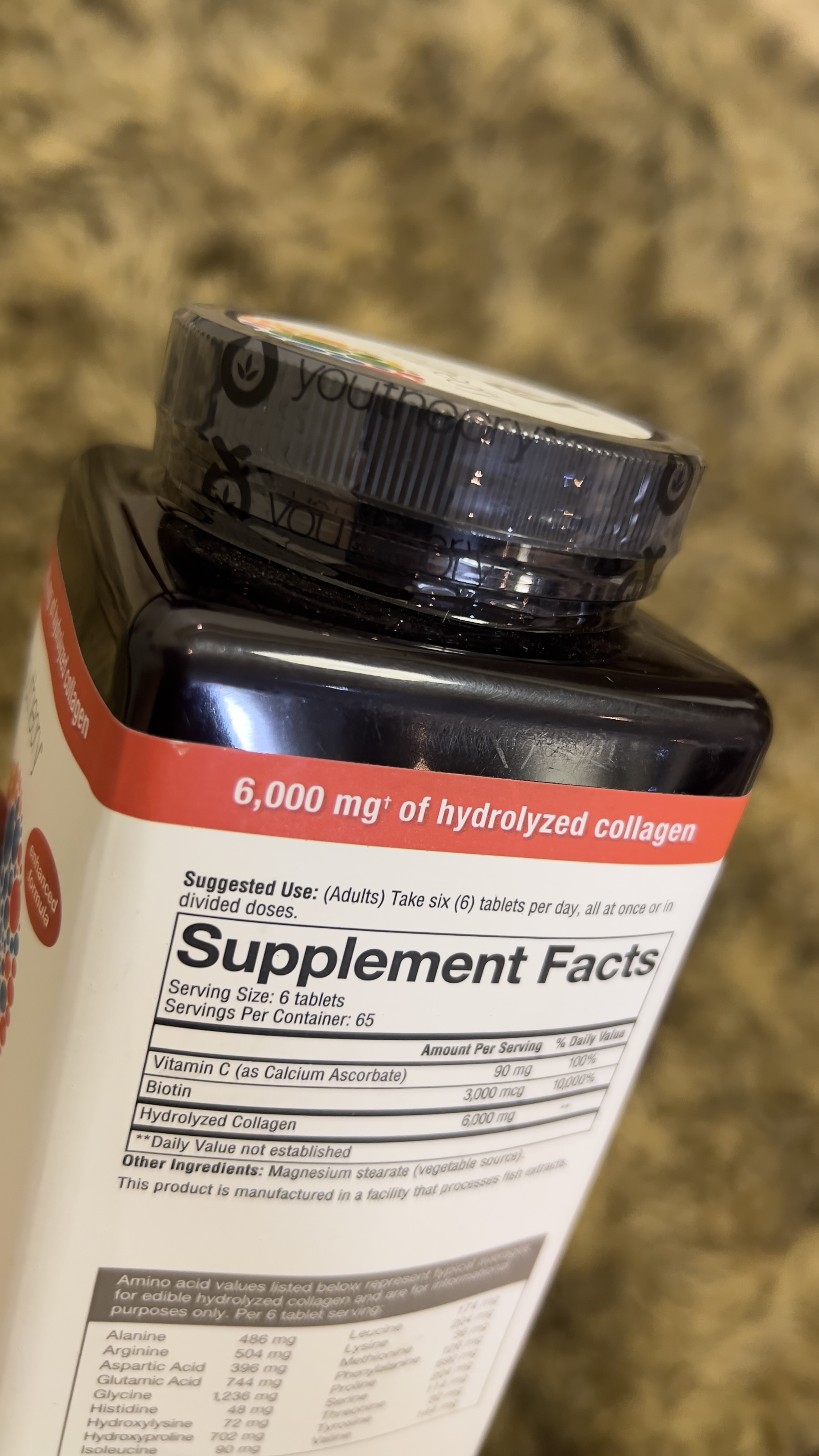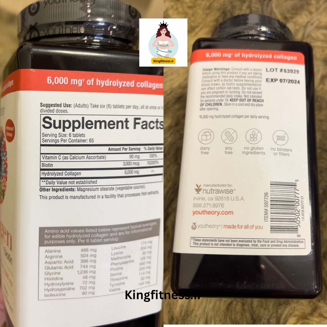 مکمل کلاژن برند Youtheory در هر وعده غذایی مقدار6000 میلی گرم کلاژن هیدرولیز شده و 90 میلی گرم ویتامین Cرا وارد بدن می کند. فرمولاسیون پیشرفته و هیدرولیز شده ی کلاژن که حاوی 18 اسید آمینه است، به راحتی هضم شده و به سرعت در بدن جذب می شود و کلاژن بدن را مجددا بازسازی می کند. پپتید های کلاژن به همراه ویتامین Cبه احیا و تقویت پوست، مو، ناخن، تاندون ها و رباط ها و ... کمک کرده و با اثرات پیری مبارزه می کند. قرص کلاژن یوتئوری فاقد لبنیات، سویا و گلوتن می باشد.