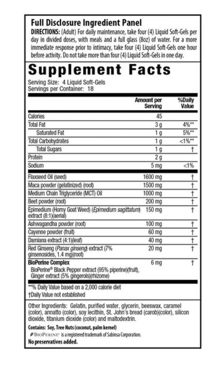 دستورالعمل: (بزرگسالان) برای نگهداری روزانه، چهار (4) ژل نرم مایع در دوزهای تقسیم شده، همراه با وعده های غذایی و یک لیوان پر (8 اونس) آب مصرف کنید. برای پاسخ فوری تر قبل از صمیمیت، چهار (4) ژل نرم مایع یک ساعت قبل از فعالیت مصرف کنید. بیش از چهار (4) ژل نرم مایع در یک روز مصرف نکنید.