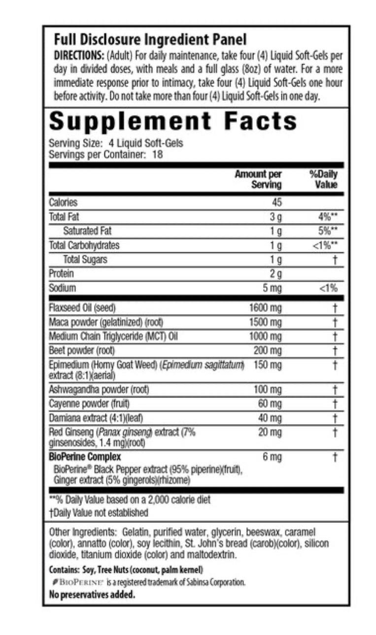 دستورالعمل: (بزرگسالان) برای نگهداری روزانه، چهار (4) ژل نرم مایع در دوزهای تقسیم شده، همراه با وعده های غذایی و یک لیوان پر (8 اونس) آب مصرف کنید. برای پاسخ فوری تر قبل از صمیمیت، چهار (4) ژل نرم مایع یک ساعت قبل از فعالیت مصرف کنید. بیش از چهار (4) ژل نرم مایع در یک روز مصرف نکنید.