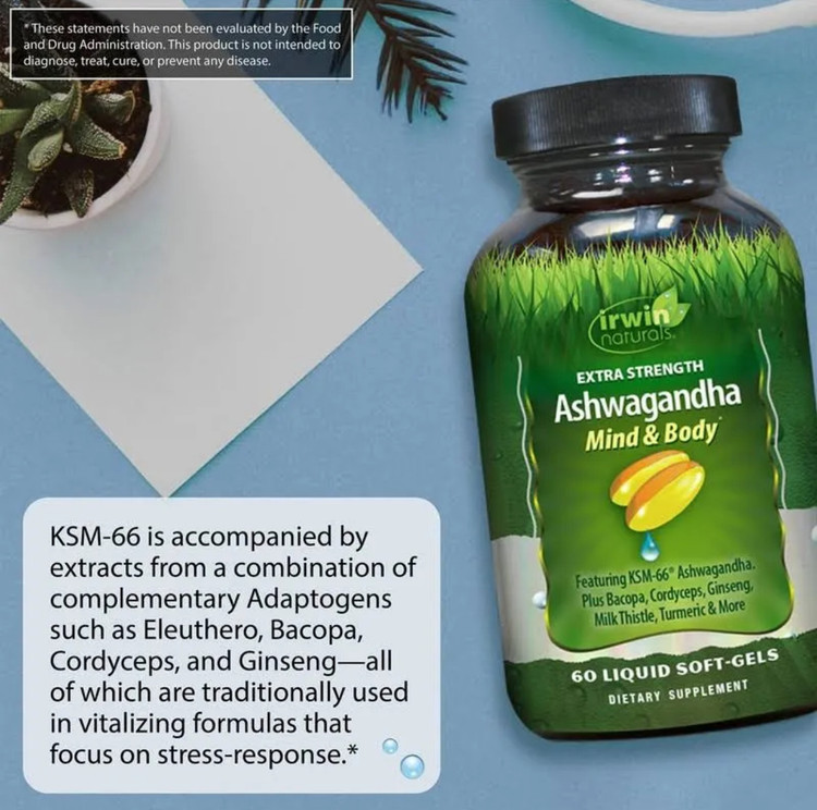 جینسینگ آشواگاندا حاوی بیشترین مقدار جینسینگ هندی موجود در بازار است که دارای خواص کاهش استرس و تنش، تقویت حافظه و افزایش تمرکز، افزایش قدرت و مقدار عضلات، بهبود عملکرد خواب، بهبود Irwin Naturals