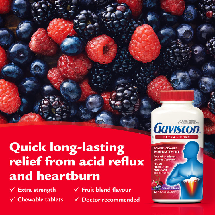 تسکین سریع و طولانی مدت سوزش سر دل: قرصهای Gaviscon Extra Strength که توسط پزشک توصیه شده است، فوراً کار میکنند و در عرض چند دقیقه تسکین طولانیمدت سوزش سر دل را ارائه میکنند که ساعتها طول میکشد. احساس کنید فوم فوم گاویسکون شروع به کار می کند