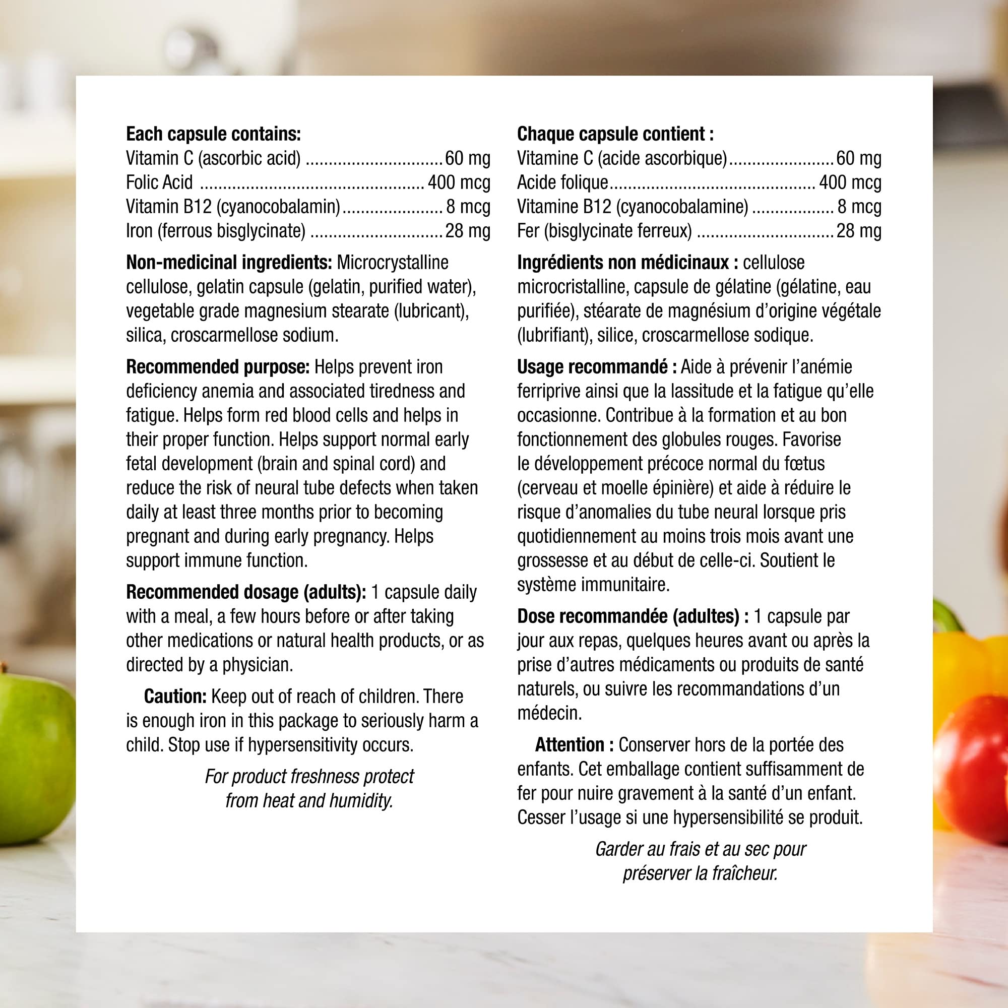 سیلیس، کراسکارملوز سدیم. هدف توصیه شده: به جلوگیری از کم خونی فقر آهن و خستگی و خستگی مرتبط کمک می کند. به تشکیل گلبول های قرمز خون کمک می کند و به عملکرد صحیح آنها کمک می کند. به حمایت از رشد طبیعی اولیه جنین (مغز و نخاع) کمک می کند و خطر نقص لوله عصبی را در صورت مصرف روزانه حداقل سه ماه قبل از باردار شدن و در اوایل بارداری کاهش می دهد. کمک می کند