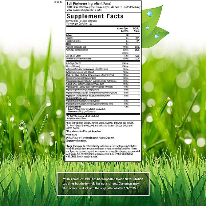 (بزرگسالان) برای حمایت عمومی از سیستم ایمنی، روزانه سه (3) سافت ژل مایع همراه با یک وعده غذایی و یک لیوان کامل (8 اونس) آب مصرف کنید.