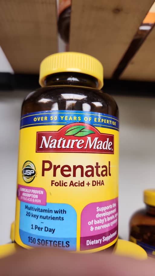 مکمل تغذیه ای دوران بارداری: حاوی یک بطری 90 عددی Nature Made Prenatal با اسید فولیک و 200 میلی گرم سافت ژل DHA برای تامین 90 روزه