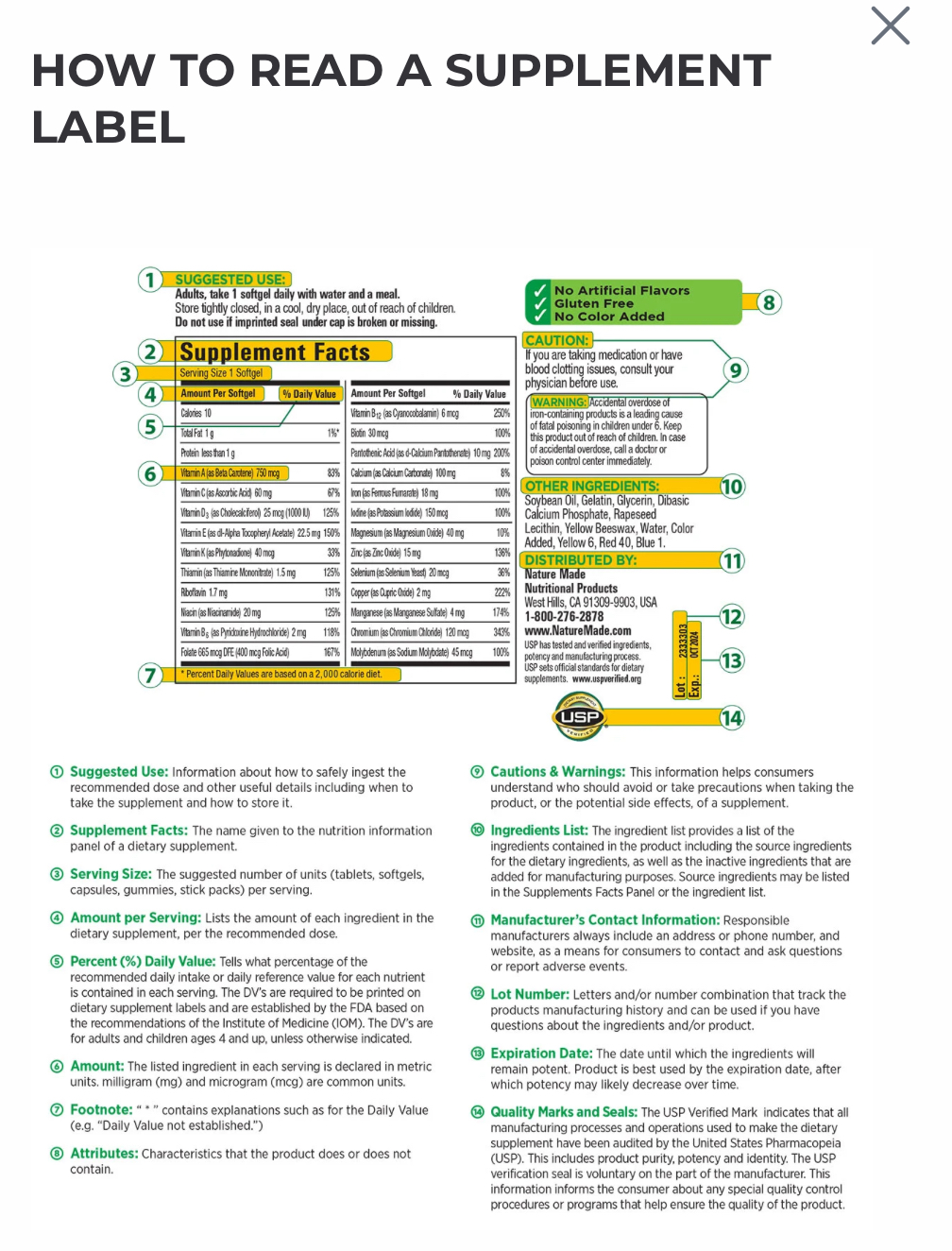 مقدار در هر وعده: 750 میکروگرم ویتامین A، 590 میلی گرم ویتامین C، 50 میکروگرم (2000 واحد بین المللی) ویتامین D3، 22.5 میلی گرم ویتامین E، 30 میکروگرم ویتامین K، 1.5 میلی گرم تیامین، 1.7 میلی گرم ریبوفلاوین، 20 میلی گرم نیاسین، 3 میلی گرم ویتامین B6، 830 میکروگرم DFE فولات (500 میکروگرم اسید فولیک)، 25 میکروگرم ویتامین B12، 30 میکروگرم بیوتین، 10 میلی گرم اسید پانتوتنیک، 220 میلی گرم کلسیم، 50 میلی گرم فسفر، 150 میکروگرم ید، 300 میلی گرم منیزیم (به صورت منیزیم) 55 میکروگرم سلنیوم، 0.9 میلی گرم مس، 2.3 میلی گرم منگنز، 395 میکروگرم کروم، 45 میکروگرم مولیبدن، 70 میلی گرم کلرید، 80 میلی گرم پتاسیم، 150 میکروگرم بور، 2 میلی گرم سیلیکون، 10 میلی گرم میکروگرم لونادیم 50، mcg0، 10 میلی گرم وانادیوم آلفا لیپوئیک اسید، 50 میلی گرم عصاره برگ چای سبز (Camellia sinensis)، 25 میلی گرم پلی فنول، 1200 میلی گرم روغن ماهی، 360 میلی گرم اسیدهای چرب امگا 3 تام (300 میلی گرم امگا 3 EPA و DHA)
